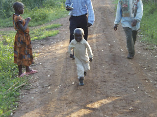 Ok, I am going to try and put the cutest pictures of my son Kasekende on here. When we got to the school on the first day I was so excited to see him. We got out of the van and I said hello to Sister Rose (the head nun) and then looked around for him. She came up to me and said "he is at the church". She than turned to a near by student and told him to run to the chapel and get Kasekende. I waited around for him to come and this is what I saw running down the hill. It was so cute. He was so excited to see me.